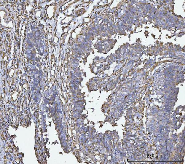 (Figure 2. IHC analysis of HLA-DRA using anti-HLA-DRA antibody (AAA19681).HLA-DRA was detected in a paraffin-embedded section of human colonic adenocarcinoma tissue. Heat mediated antigen retrieval was performed in EDTA buffer (pH 8.0, epitope retrieval solution). The tissue section was blocked with 10% goat serum. The tissue section was then incubated with 2 ug/ml mouse anti-HLA-DRA Antibody (AAA19681) overnight at 4 degree C. Peroxidase Conjugated Goat Anti-mouse IgG was used as secondary antibody and incubated for 30 minutes at 37 degree C. The tissue section was developed using HRP Conjugated Mouse IgG Super Vision Assay Kit with DAB as the chromogen.)